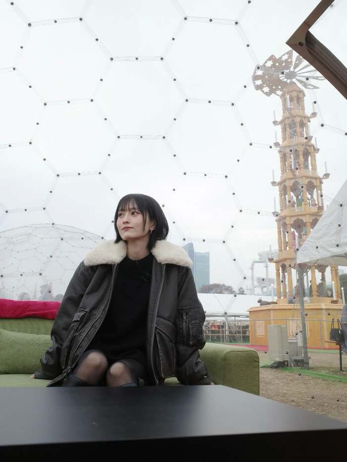 さらに六角形のパネルが連なるジオデシックドームの中では、緑のソファに座り、やや右に視線を向けて思索にふけるような穏やかな表情を見せています。