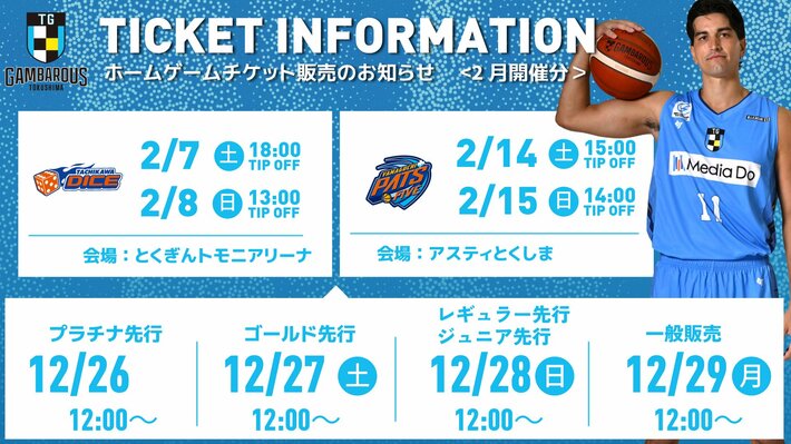 徳島ガンバロウズは、B3リーグ2025-26シーズン、2026年2月開催ホームゲーム観戦チケットを12月26日(金)12:00より販売開始いたします。皆さまのご来場、お待ちしております!