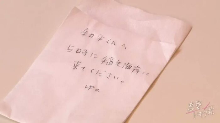 「和平くんへ、5時に稲毛海岸に来てください。ゆの」