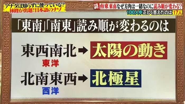 そして、同じ方角を表す「南東」と「東南」の2種類が存在する理由は、なぜなのか?こちらの謎には「東西南北」という日本語の表現が深くかかわっているという。