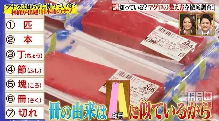そして、「1ころ」を短冊に似た形にカットすると「1冊(さく)」に呼び方が変わり、冊のマグロを刺身用に切ると「1切れ」に変化する。