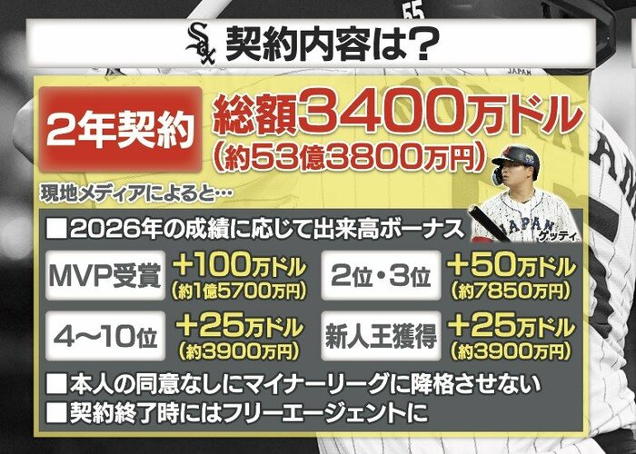 2年契約で総額が3400万ドル(約53億3800万円)。さらに成績に応じて、MVPを取るとプラス100万ドル、MVPのランキングでも2位3位だと50万ドル、4位から10位でも25万ドル、さらには新人王だと25万ドルプラスされるという内容も含まれています。