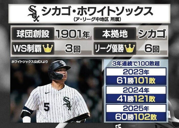 実はホワイトソックスは今季リーグワーストの102敗(60勝)を喫するなど低迷の真っただ中。また村上選手の契約は異例の2年契約です。