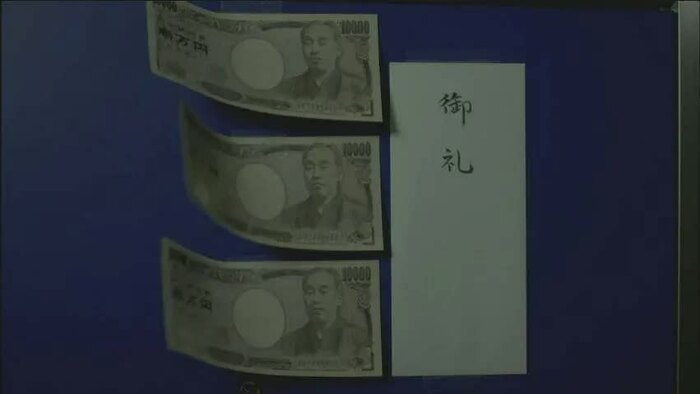 だが、振り返ると、玄関のドアに、リカに渡したはずの3枚の1万円札と「御礼」の封筒が、キレイに並べて貼り付けられていた。
