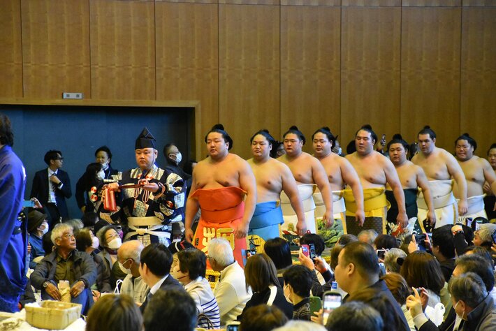 力士たちが七五調のリズムや独特の掛け声と共にユーモアを交えながら歌を披露しました。