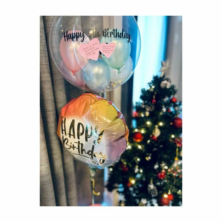 写真を見ると、お部屋には「Happy 5th Birthday」と書かれた透明のバルーンやカラフルなバースデーバルーンが浮かんでいます。奥には、赤のオーナメントにより、華やかになったクリスマスツリーが飾られていることが分かります。