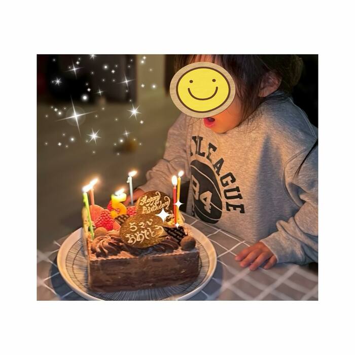 また、チョコレートの板に「5さい おめでとう」と書かれた、フルーツ盛りだくさんのチョコレートケーキも。写真には、トレーナースタイルの娘さんがろうそくの火を消そうとする瞬間が収められていて、大切な思い出の1枚です。