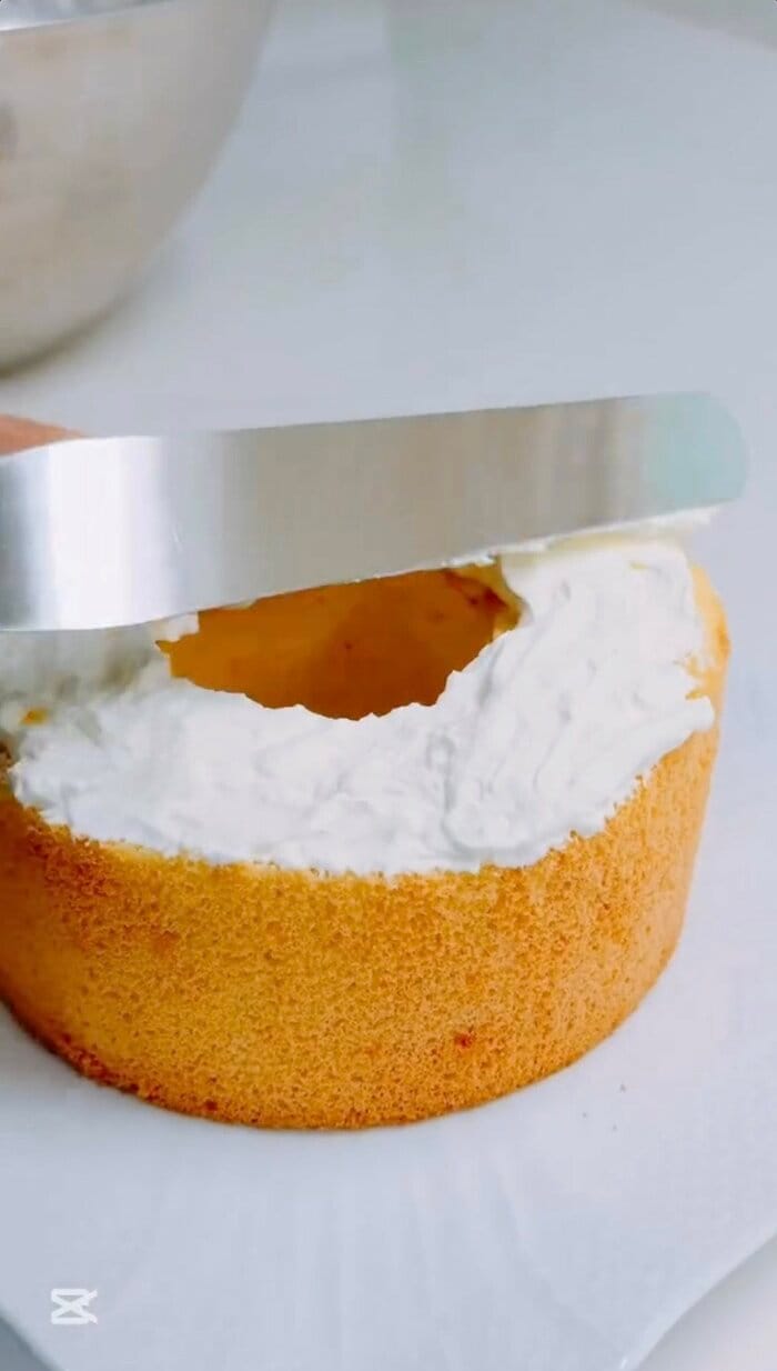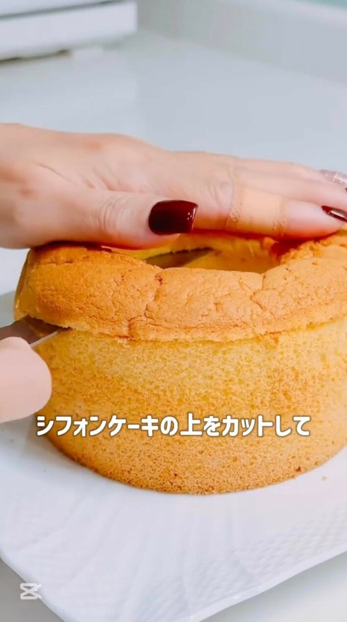 焼き上がったシフォンケーキは上の部分をカットして平らにしたら…