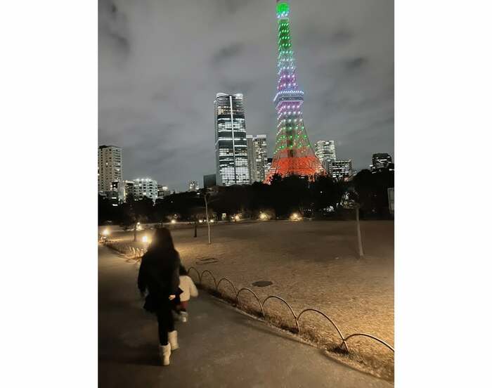 そして、きらびやかにライトアップされた、東京タワーの近くを散歩している様子も。