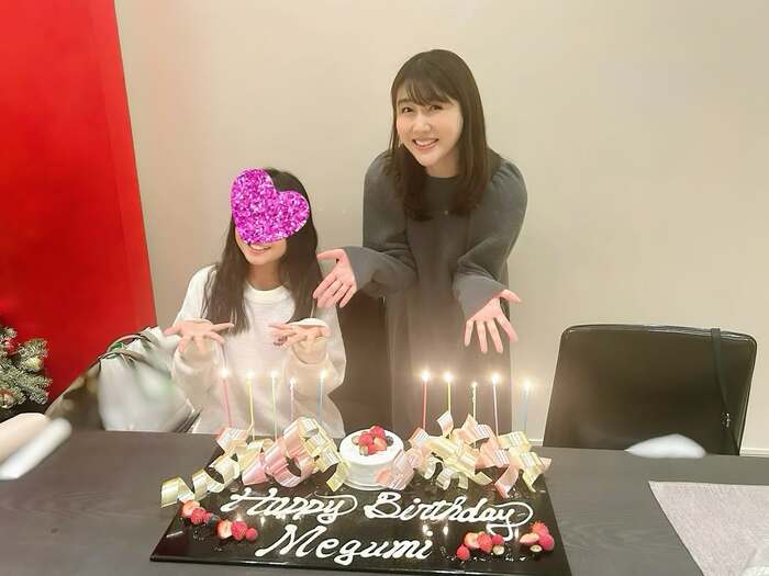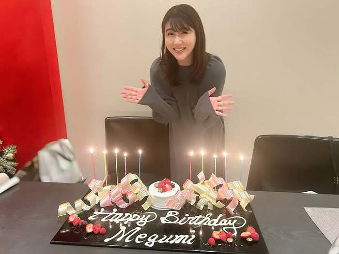テーブルに置かれた、高級感ある大きな黒いプレートには、いちごなどの果物が盛り付けられたホールケーキに、「Happy Birthday Megumi」のメッセージが。