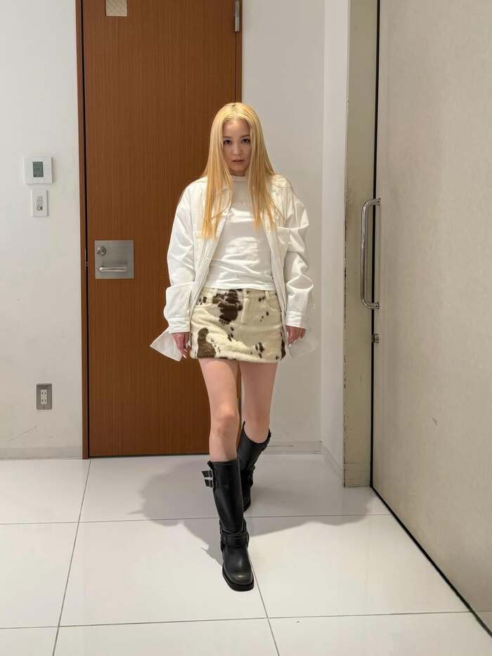 写真には、白シャツにカウ柄のミニスカート、足元には黒のロングブーツを合わせた西野さんの姿が。胸元まである金色ストレートヘアも相まって、“ギャル”らしさを感じるスタイルです。