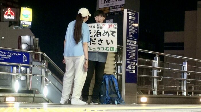 リュック一つで全国をさすらい、夕暮れの街角で「今晩泊めてください」と書かれたフリップを掲げるシュラフ石田さん(33)。