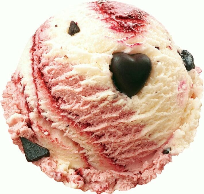 ラズベリーアイスクリームとホワイトチョコレート風味アイスクリームの組み合わせに、甘酸っぱいラズベリーリボン、そしてラズベリーソース入りのいつものハート型菓子と、小さくてかわいいミニハート型菓子の2種類がたっぷり!
