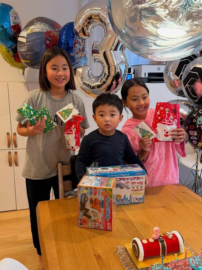 さらに、3人の子どもたちが笑顔で集まる賑やかな一枚も。2人のお姉ちゃんに挟まれ中央に座るリアムくん。それぞれがリアムくんへのプレゼントを手に持ち、3姉弟仲良しな雰囲気に包まれています。
