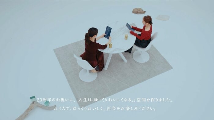 カメラが回るなか、席につく2人。テーブルには「人生は、ゆっくりおいしくなる。」メニューと題した質問カードが用意されています。
