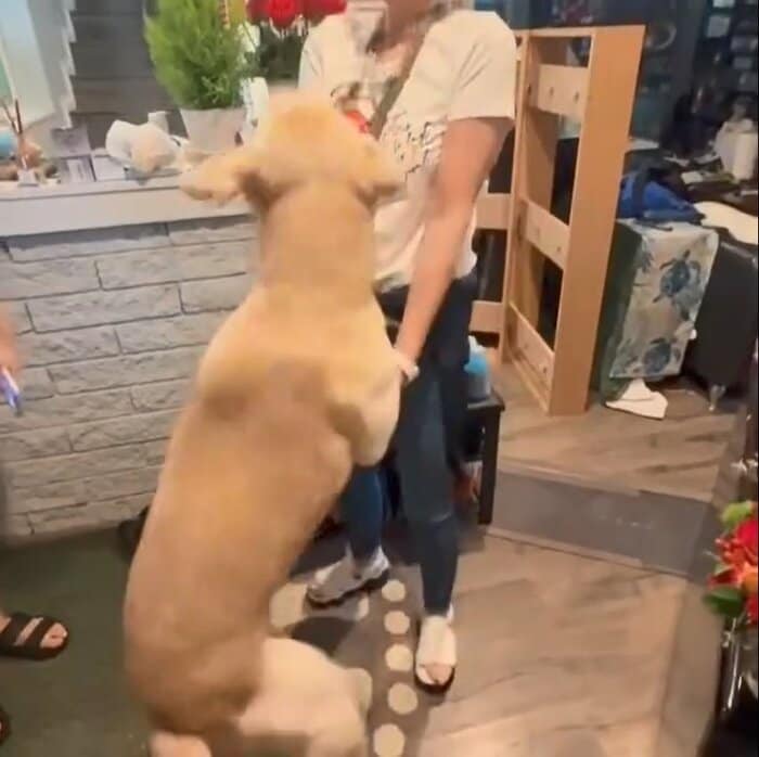 三四郎君は、尻尾を大きく振りながら秋野さんの周りを1周すると、秋野さんに向かってピョーンとジャンプ!かなりハイテンションで、会えた喜びが伝わってきます。
