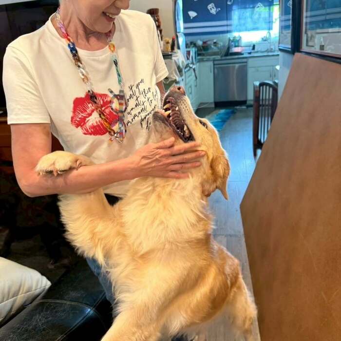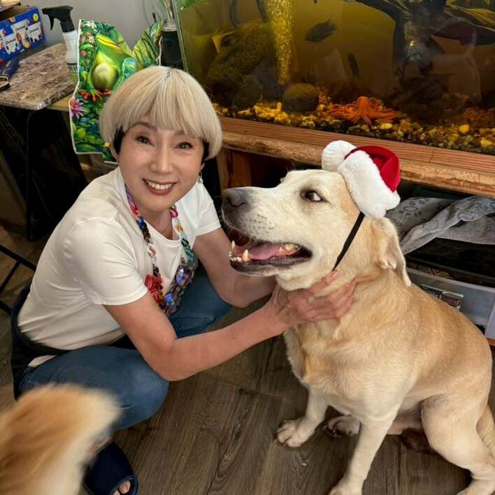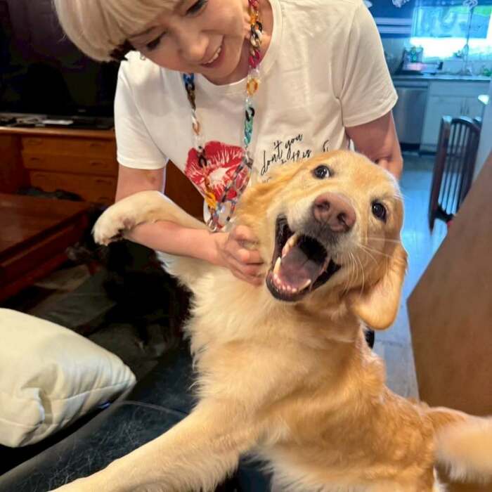 写真には、ゴールデン・レトリーバーの三四郎君に手を添え、笑顔を浮かべる秋野さんの姿が。
