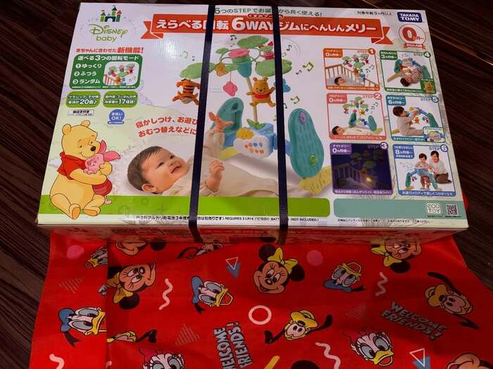 そんな3人の周りには、リボンのかかった箱やお菓子の袋、赤い手提げ袋などがズラリと並びます!さらに、カーテンの前には星の装飾、中央にはオーナメントで彩られたかわいらしいツリーも。とても華やかな空間で、初クリスマスを存分に楽しんでいる様子。