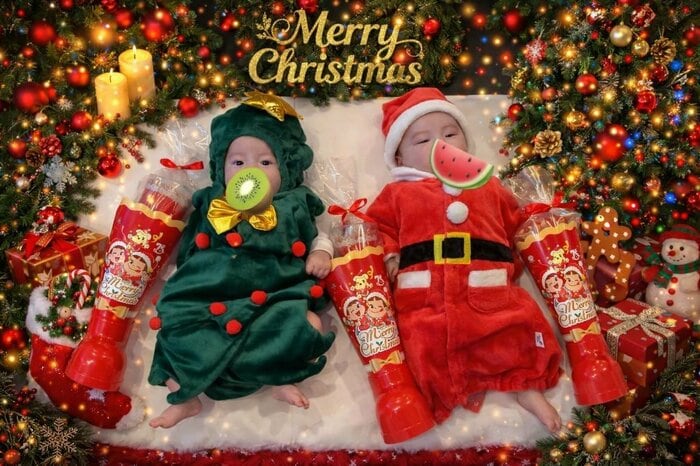 “もみの木”と“サンタ”になりきった双子が、真っ白な毛布の上に寝転んでいます。2人の周りには、キラキラと輝く無数の光や、プレゼントの箱、明かりのついたキャンドルなど、多数のオーナメントが散りばめられています。頭の上には「Merry Christmas」の文字も飾られ、まるで双子がリースの中におさまったような1枚。