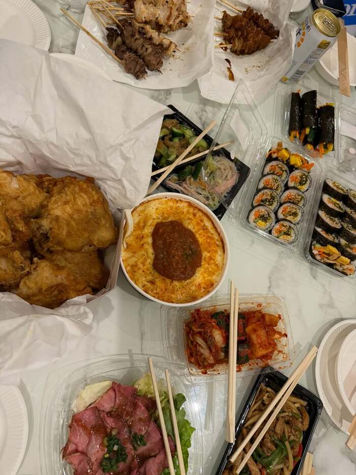 ゴマのかかったキンパやミートドリア、大量の串焼きなど、テーブルの上はごちそうだらけです。