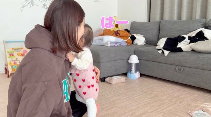 西野さんが「あと“ばあ”もするね?」と言うと「ばあ」と言ったり…「あか」なども上手に発音するにこりちゃん。とにかく真似をすることが増えたのだといいます。