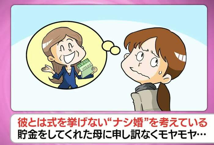 「母が結婚式の資金を貯金してくれているのだが、彼とは経済的な理由で結婚式をしない『ナシ婚』を検討中。母に申し訳なくてモヤモヤする」という、女性のお悩みも登場しました。