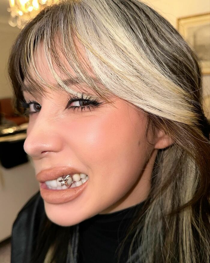 歯に装着したアクセサリーを見せつけるようなアーティスティックな1枚も。