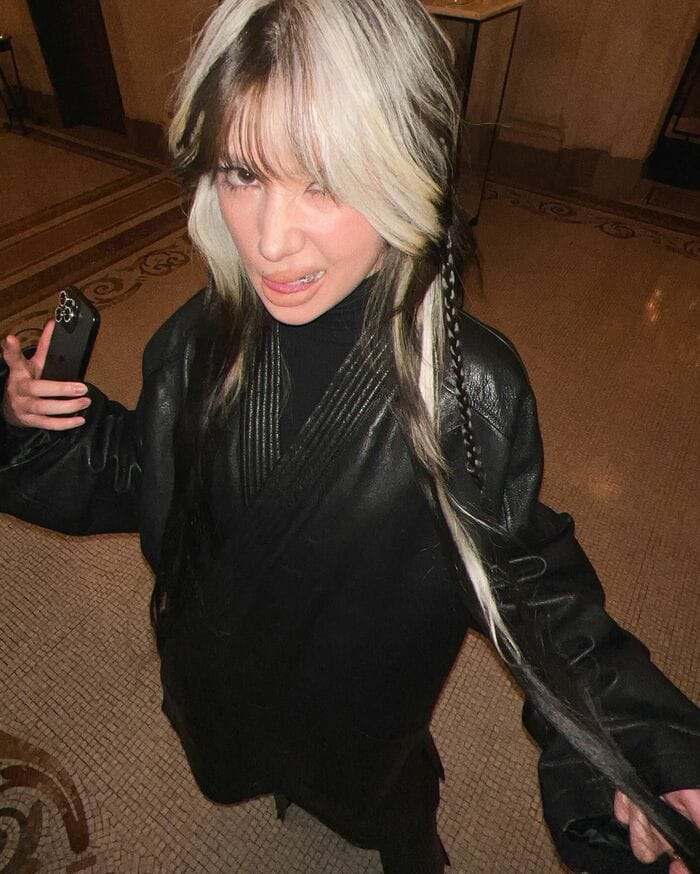 白と黒の新しいヘアスタイルに、全身ブラックのモードなコーディネートを披露し、ファンからの注目を集めました。