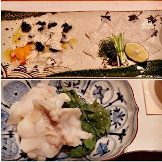 高級感あるお皿に盛り付けられた、ふぐのお刺身や…