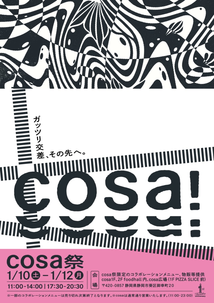 株式会社cosa(所在:静岡市葵区御幸町20番地 代表取締役: 大井一郎)は、開業1周年を記念したイベント第2弾 『cosa祭(コーササイ)』 を2026年1月10日(土)から1月12日(月・祝)までの3日間、開催いたします。本祭は、施設コンセプトである「交差」をテーマに、静岡の街と個、文化と日常がしなやかに交差し、多彩な体験を提供し、静岡の街に「小さな文化のうねり」を生み出す、ブランドビジョンを体現するイベントです。
