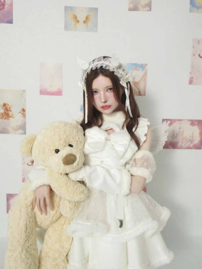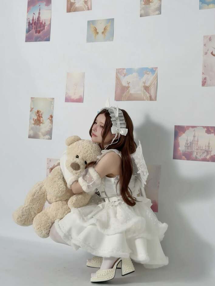 大きなアイボリー色のテディベアを両腕で優しく抱きしめるショットでは、背景に雲やお城、天使の翼などが描かれたパステル調の写真プリントが飾られており、穏やかな微笑みと相まって夢幻的な一枚となっています。