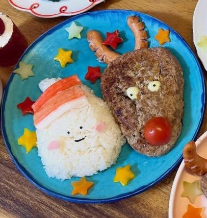 白米、のり、ハム、カニカマでサンタクロースの顔が作られていて、二等辺三角形のような形で焼かれたハンバーグはトナカイの顔に!真っ赤な鼻にはミニトマトが、そして、細かく切れ目を入れて焼いたウインナーは弧を描くように伸びたツノを再現しています。お皿の周りには星形に型抜きしたパプリカやにんじんなどが散りばめられていて、ご飯の時間がとっても楽しくなりそうです♪