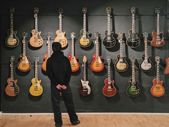 写真には、壁に展示された何本ものギターをじっくりと眺める、若井さんの後ろ姿や、