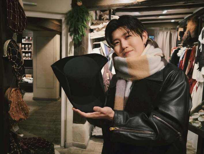 ブラックのハットを手に取り、にっこりとほほ笑む若井さんの姿が。レザージャケットにふわふわのマフラーを合わせた、オシャレなコーディネートです。