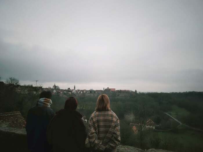 最後の写真には、高い場所からドイツ街並みを眺める3人の後ろ姿が添えられていました。