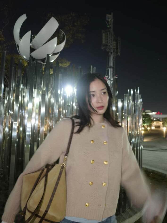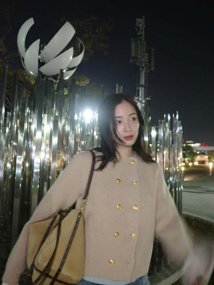 無造作ヘアでニコッとほほ笑む様子も。キメキメのポーズではなく、夜の街を散歩している一コマを捉えたような写真に、みとれてしまいますね。