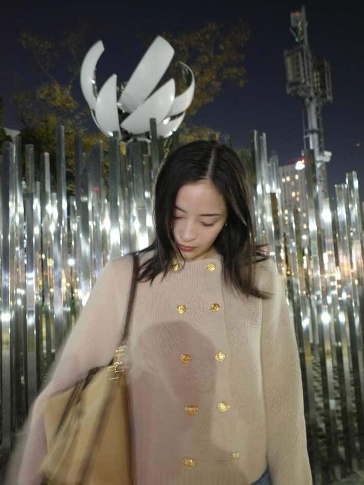 写真には、夜の街で金ボタンが目を引くベージュのアウターを着てどこかを見つめる広瀬さん。