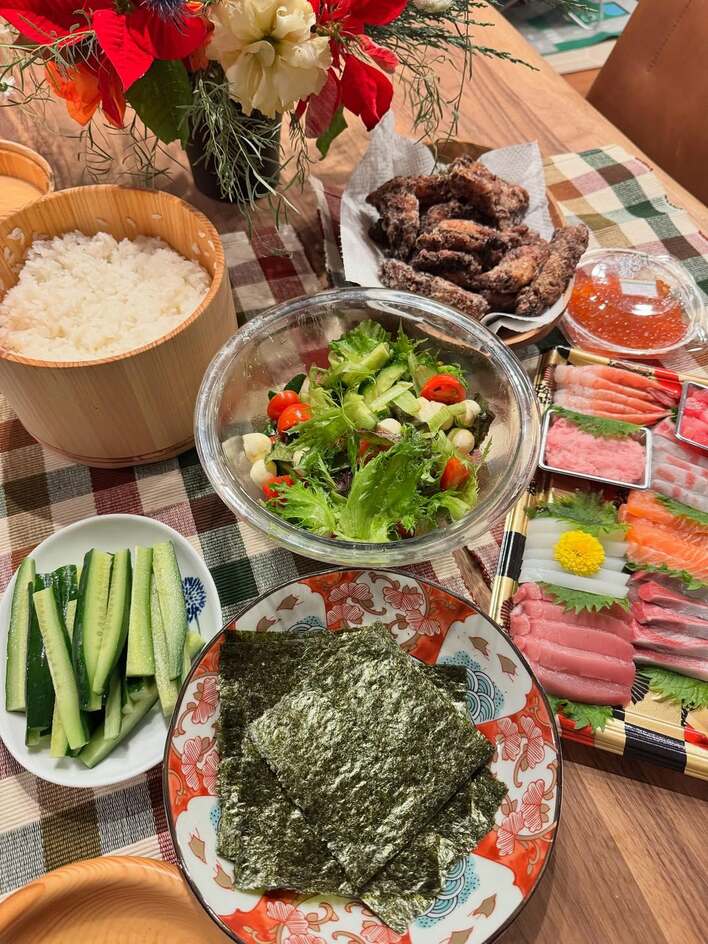 クリスマスディナーで手巻き寿司などのぜいたくメニューを披露しました。