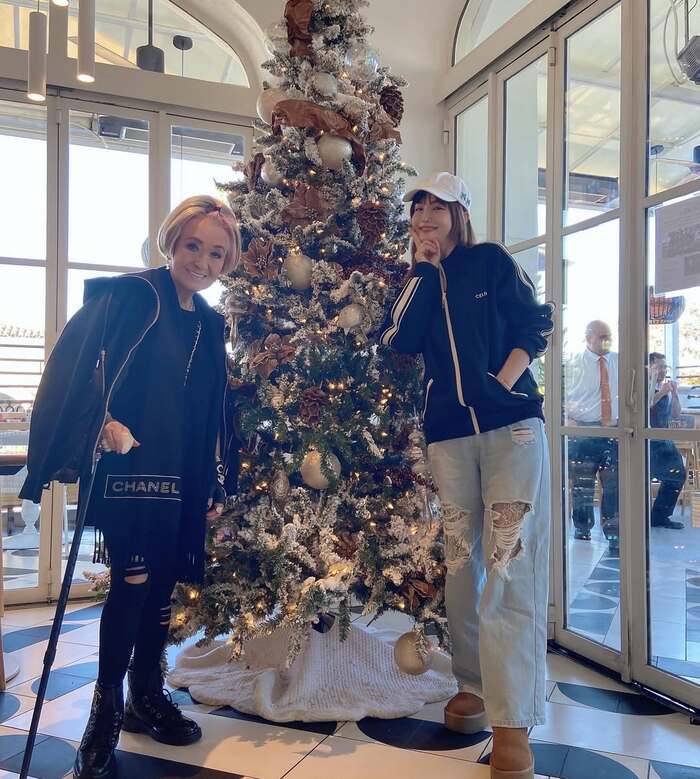 そこには、銀色のオーナメントや大きな松ぼっくりが飾られたツリーとともに、笑顔で記念撮影をする2人の姿が!平子さんは、ネイビーのトップスにダメージジーンズを合わせたカジュアルコーデ。一方、金髪ボブがお似合いの母は、全身クールなブラックコーデになっています。