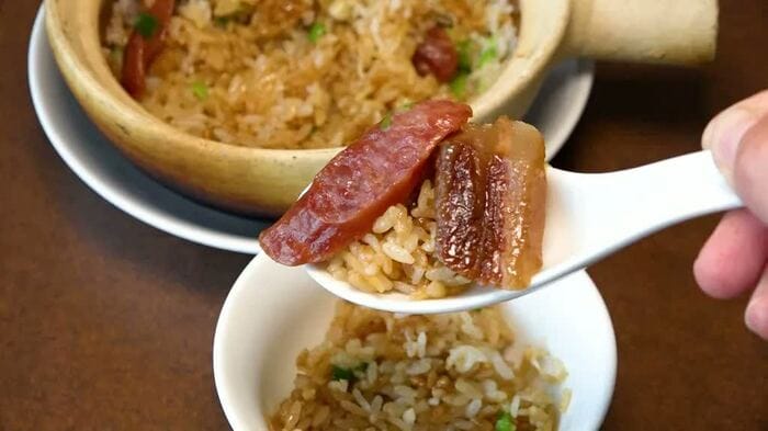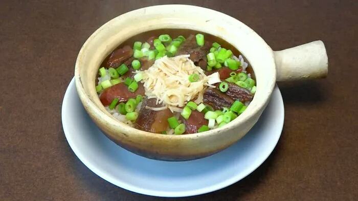 豚ガラ、鶏ガラ、エビの殻などが入った、シャンタンスープで米を15分炊き、腸詰め、自家製干し豚のバラ肉、干し貝柱を入れて、さらに5分。そこにしょうゆだれをかけると完成します。