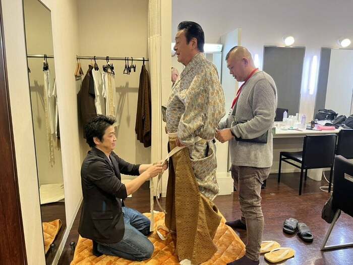 薄いグレー地にキナリや茶色の小紋柄の着物を着付けしている様子を公開しました。重厚感ただようゴールドのはかまがとてもよくお似合いで、品のある雰囲気をまとわせています。