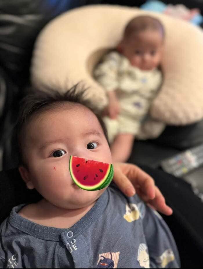 双子は、中川さんの上半身を完全に隠してしまうほどすくすくと成長していて、新生児の頃と比べると体の大きさは倍以上になっているように見えます。