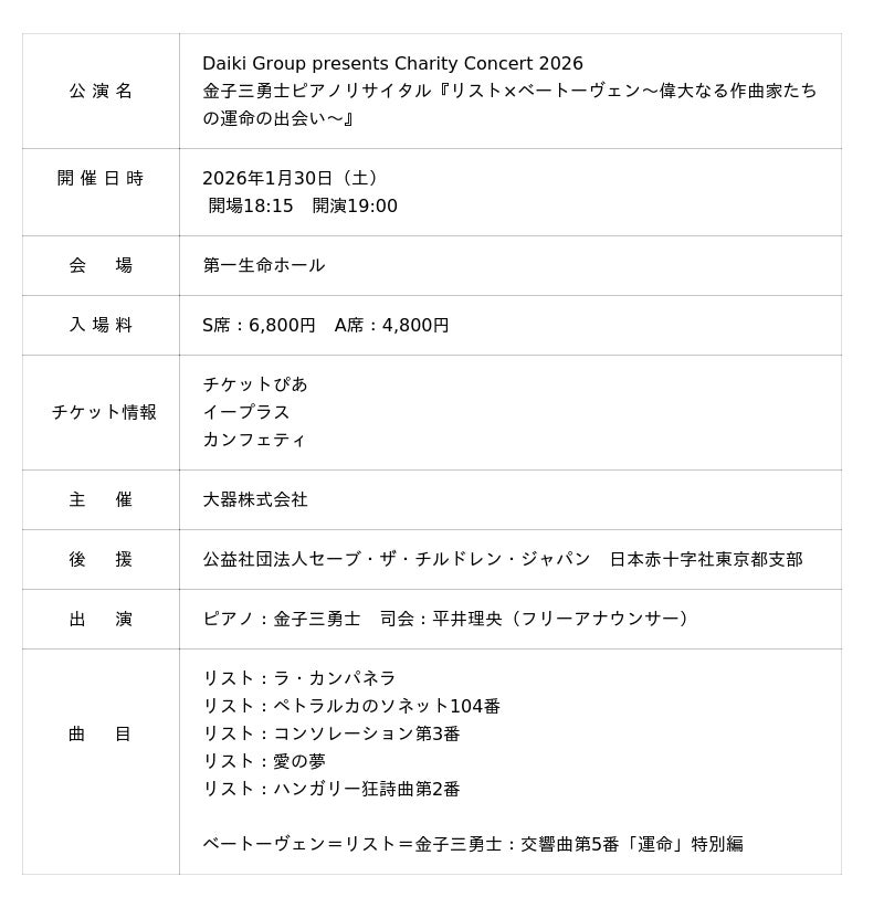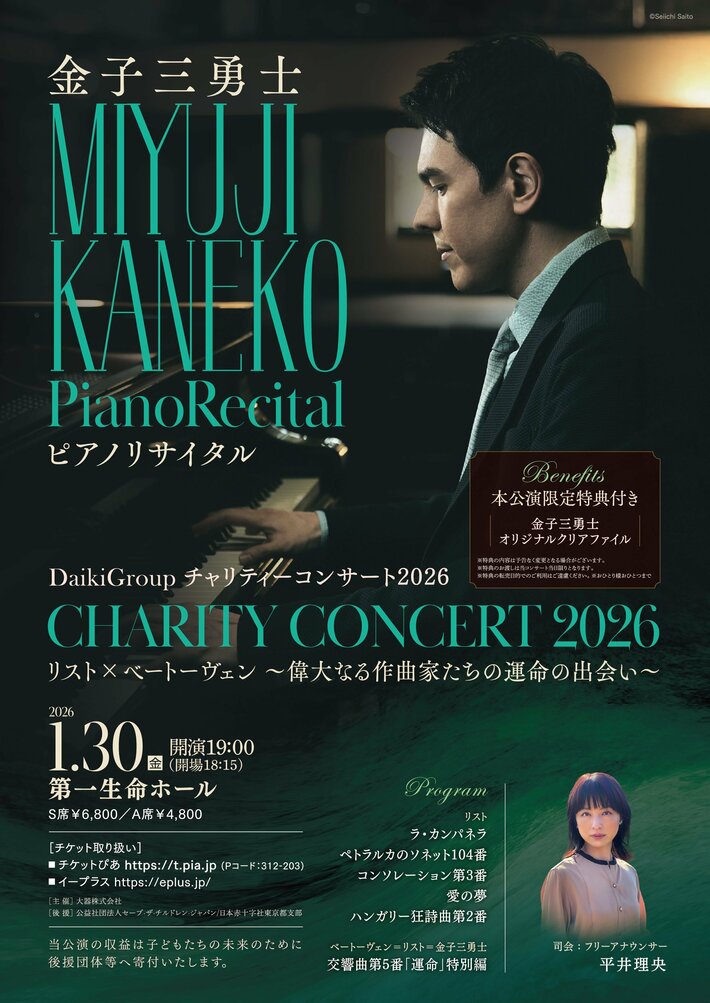 大器株式会社(東京都港区芝2丁目29番10号 Aフロント芝二丁目ビル6階/代表取締役 島田 昌和)は、2026年1月30 (金)に 第一生命ホール(東京都中央区)にて、~すべての子どもたちに明るい未来を~Daiki Group presents Concert 2026を開催いたします。 今回はピアニストの金子三勇士さんをお迎えして『リスト×ベートーヴェン~偉大なる作曲家たちの運命の出会い~』をテーマに、リスト、ベートーヴェンの数々の名曲をお送りいたします。また、司会にはフリーアナウンサーの平井理央さんを迎え、進行を務めていただき華やかな語りとともに特別な一夜をお届けいたします。