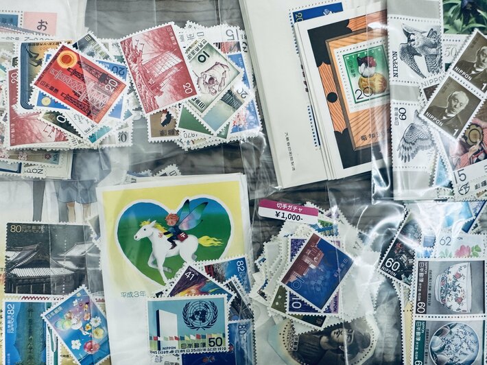 記念切手、昭和レトロな切手、コレクター向けの絵柄切手などがランダムで封入されており、何が出るかわからないワクワク感。そしてお得感が支持されています。