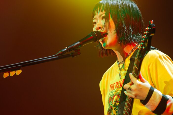 ひずんだベースのサウンドが会場の空気感を一変させると疾走感溢れる『最高速度』を披露。ステージをロックなムード全開に塗り替えると、続いてギターのリフと4つ打ちのドラムから始まる『狙うは君のど真ん中』で盛り上がりをさらに加速させます。
