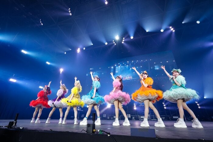 7人はステージいっぱいに広がって、観客に向けて手を振ったり、メンバー同士で目を合わせながら、自身もライブを楽しんでいるよう。