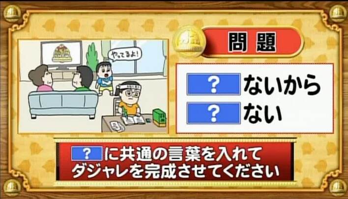 最初は「脳ミングアップクイズ」から、ダジャレ穴埋め問題。「?」の中に共通する言葉を入れてダジャレを完成させてください。
