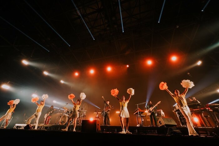そして後半戦2曲目に始まったのが『新宝島』。オレンジと黄色のライトに変わりポップな世界へと『EARTH STAGE』を誘うと、ポンポンを持ったダンサーがステージIN、山口さんも会場も全員でダンスするこの曲ならではの光景が広がります。