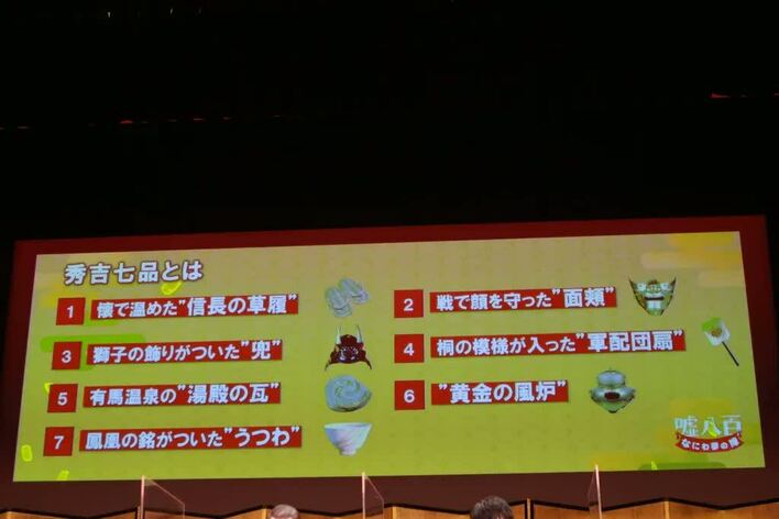 「秀吉七品(※)が展示されている博物館に泥棒が侵入し、どれか一品が奪われてしまった。その一品とは?」とのお題に登壇者の皆さんは、フリップで回答。それに合わせた、2023年の運気が明かされました。