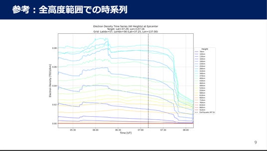 京都大学大学院情報学研究科の梅野健教授と、京都大学工学部4回生の山本信吾氏が中心となるグループ(物理統計学分野)は、ちょうど2年前の元旦に発生した能登半島地震について、同研究科で開発された高速高精細3次元電離圏トモグラフィー技術(FCIT)を用いて、地震前後のデータに基づいて高度別の電子数密度の時間変化を調査しました。その結果、高度310km付近の電子数密度が地震発生直前の14時40分から15時15分(地震発生の約1時間半前から55分前)に異常な増加を示し、その後急激に減少する現象を特定し、この結果は2025年12月20日に開催された日本地震予知学会学術講演会にて発表されました。